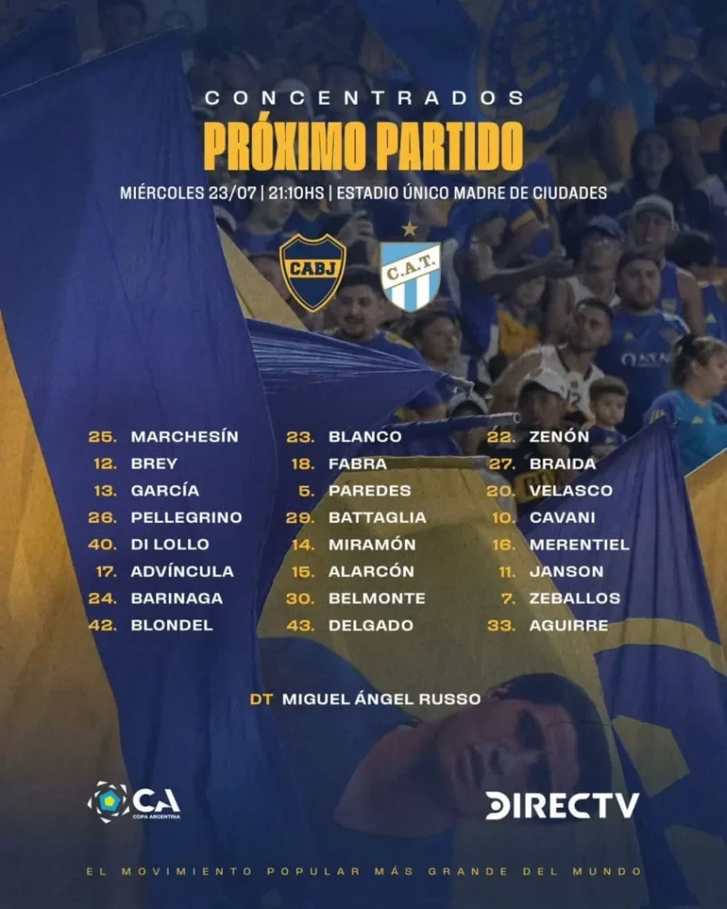 El Xeneize arrancó el Torneo Clausura 2025 con dos empates, Argentinos Juniors en La Paternal y Unión en La Bombonera, y tiene la oportunidad de cambiar la cara ante Atlético Tucumán por Copa Argentina. Miguel Ángel Russo confirmó los de convocados para el partido de mañana desde las 21:10 en el Estadio Madre de Ciudades de Santiago del Estero.