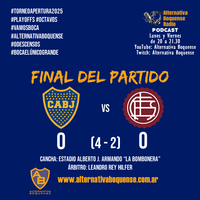 Boca Juniors, y sin sobrarle nada, logró el objetivo de pasar a cuartos de final del Torneo Apertura 2025 después del empate 0-0 ante Lanús y ganarle por 4-2 en la tanda de los penales. La Bombonera habló, expresó toda su bronca por la actualidad del equipo y pidió que se vayan todos, incluso la dirigencia actual. Sobre el partido lo podemos resumir así: una noche de bajo vuelo futbolístico.