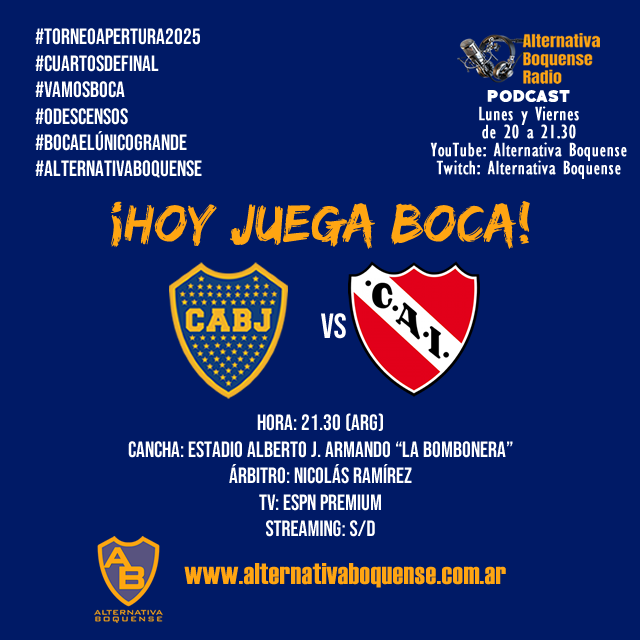 Boca Juniors e Independiente juegan por los cuartos de final del Torneo Apertura 2025, desde las 21.30 en La Bombonera, que viene de expresarle a jugadores y dirigentes su inconformismo. Sin margen de error, el Xeneize debe pasar a semifinales, en donde espera Huracán, que le ganó por 1-0 a Rosario Central en Arroyito y jugará, sea quien sea que pase hoy, de visitante.