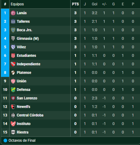 Tabla de Posiciones – Torneo Apertura 2026 – Zona A – Fecha 1