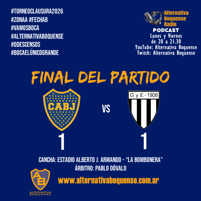 Boca Juniors volvió a decepcionar a su gente en La Bombonera con un magro empate 1-1 ante el modesto Gimnasia y Esgrima de Mendoza, por la Fecha 8 del Torneo Apertura 2026, con arbitraje de Pablo Dóvalo.