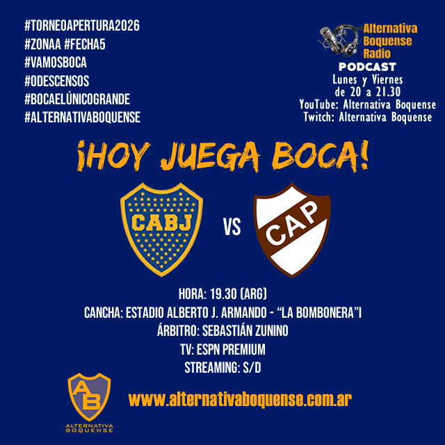 Boca Juniors recibe a Platense en La Bombonera, por la Fecha 5 del Torneo Apertura 2026, con arbitraje de Sebastián Zunino. El equipo de Claudio Úbeda buscará dar vuelta la página, y dejar atrás la mala imagen mostrada ante Vélez en el José Amalfitani y sumar otra victoria de local. Platense, por su parte, intentará prolongar su buen inicio de campeonato.