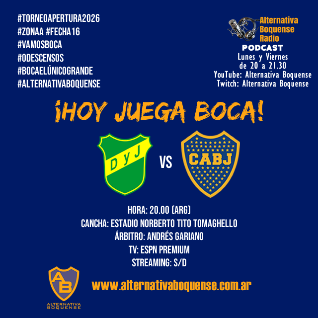 Boca Juniors visita a Defensa y Justicia desde las 20.00 (ARG) en el Estadio Norberto Tito Tomaghello que tendrá ambas hinchadas, por el primer partido de la Fecha 16 de la Zona A del Torneo Apertura 2026, con arbitraje de Andrés Gariano. El Xeneize viene de quedarse con el Superclásico de visitante y extendió su invicto a 13 partidos, quedando a tiro del primer puesto de la tabla, pero para alcanzarlo deberá ganarle al Halcón, que no suma puntos desde hace tres jornadas.