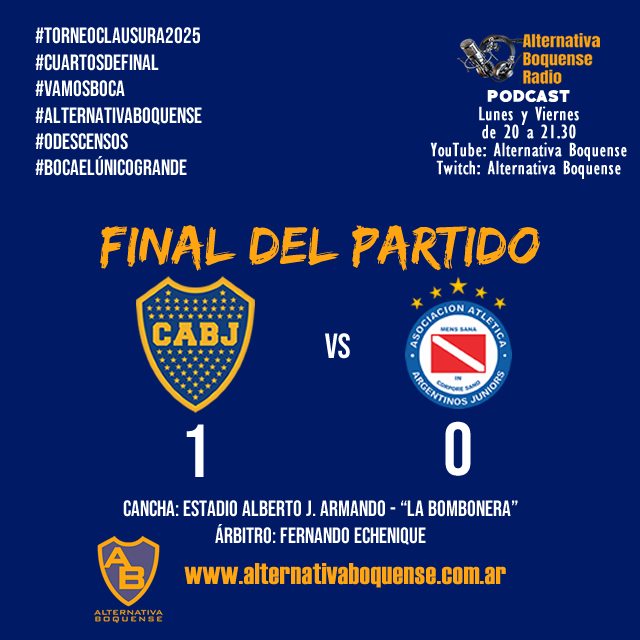 Por los cuartos de final del Torneo Clausura 2025 Boca Juniors recibió a Argentinos Juniors en La Bombonera, y le ganó 1-0, y se clasificó para la siguiente instancia del torneo.
