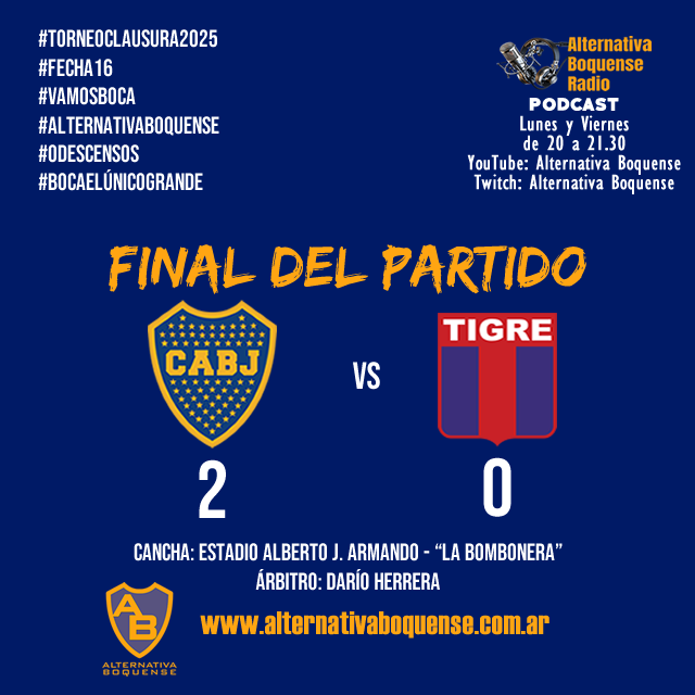 Boca venció 2 a 0 a Tigre en La Bombonera y se clasificó a los octavos de final del Torneo Clausura 2025 como primero de la Zona A, por lo que jugará todas las instancias de local, salvo una posible final que es en cancha neutral. Ayrton Costa y Edinson Cavani convirtieron los goles Xeneize.