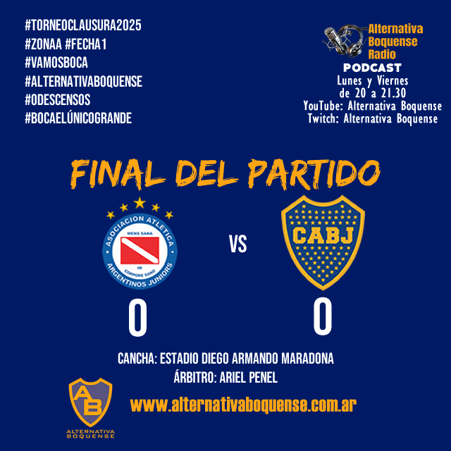 Boca Juniors empató con Argentinos Jrs. 0-0 en el Estadio Diego Armando Maradona, partido correspondiente a la Fecha 1 de la Zona A del Torneo Clausura 2025.