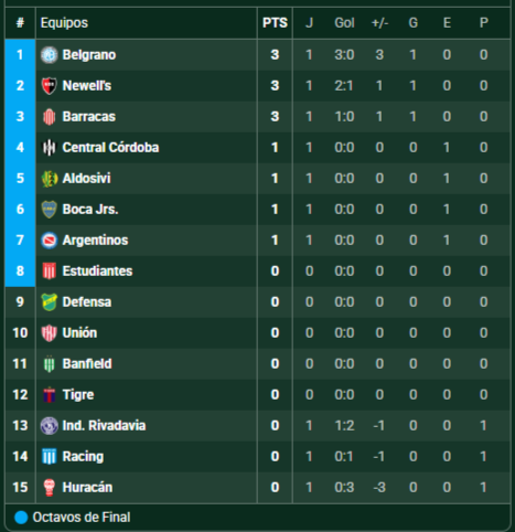 Tabla de Posiciones – Torneo Clausura 2025 – Zona A – Fecha 1