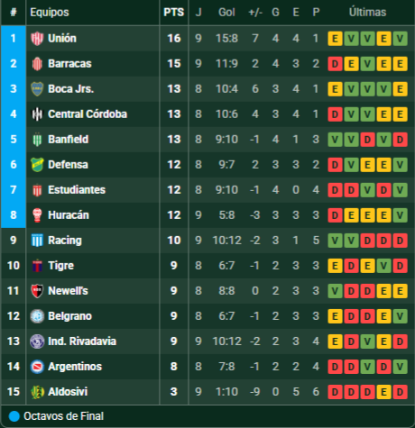 Central Córdoba, con Omar De Felippe de DT, llega también con tres victorias, cuatro empates y una derrota. El equipo santiagueño se ubica un puesto por debajo en la tabla debido a la diferencia de gol.