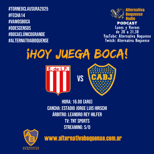 Hoy, desde las 16.00 (ARG), Boca Juniors visita a Estudiantes LP en el UNO, con arbitraje de Leonardo Rey Hilfer, por la Fecha 14, de la Zona A, del Torneo Clausura 2025. A tres fechas para el final de la fase regular, ambos equipos se juegan mucho en las dos tablas, el que gane el partido quedará momentáneamente en lo más alto de la Zona A y dará un paso importante en la anual pensando en la clasificación a las competencias internacionales del 2026.