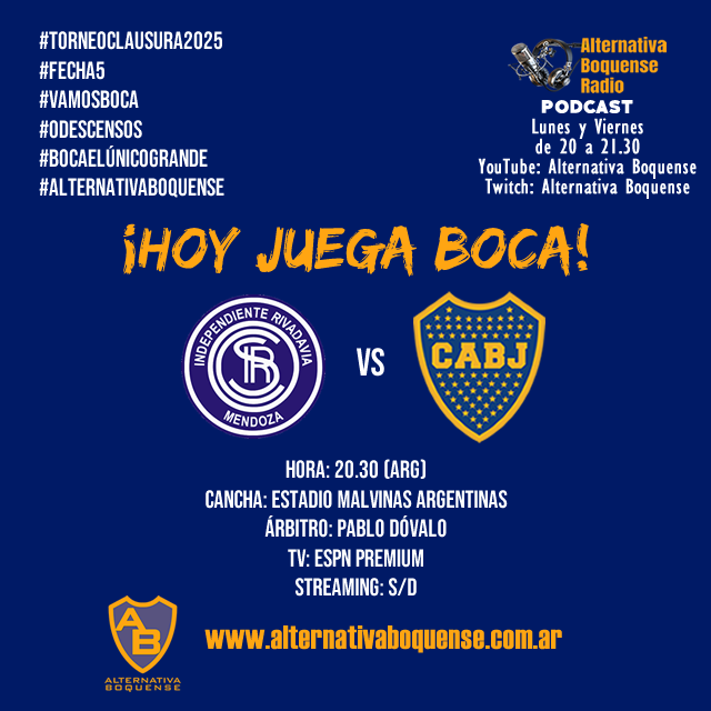 Boca Juniors visita a Independiente Rivadavia por la Fecha 5 del Grupo A del Torneo Clausura 2025. El Xeneize llegó a Mendoza con la obligación de terminar con la peor racha sin victorias de su historia, que se inició el 19 de abril. El partido se jugará desde las 20.30 (ARG),en el Estadio Malvinas Argentinas, con arbitraje de Pablo Dóvalo.