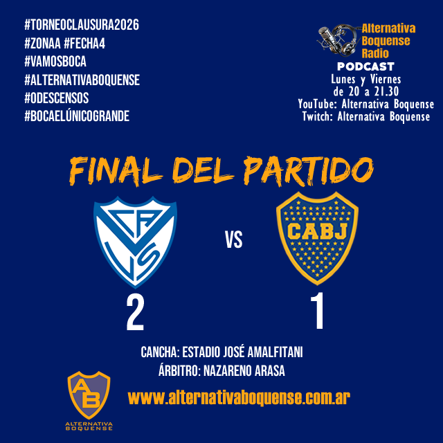 Boca Juniors cayó en su visita a Vélez Sarsfield por 2 a 1 en el Estadio José Amalfitani, encuentro correspondiente a la Fecha 4 del Torneo Apertura 2026. Los goles para el local fueron convertidos por Matías Pellegrini, en dos oportunidades, mientras que para el Xeneize descontó Iker Zufiaurre sobre el final del partido.